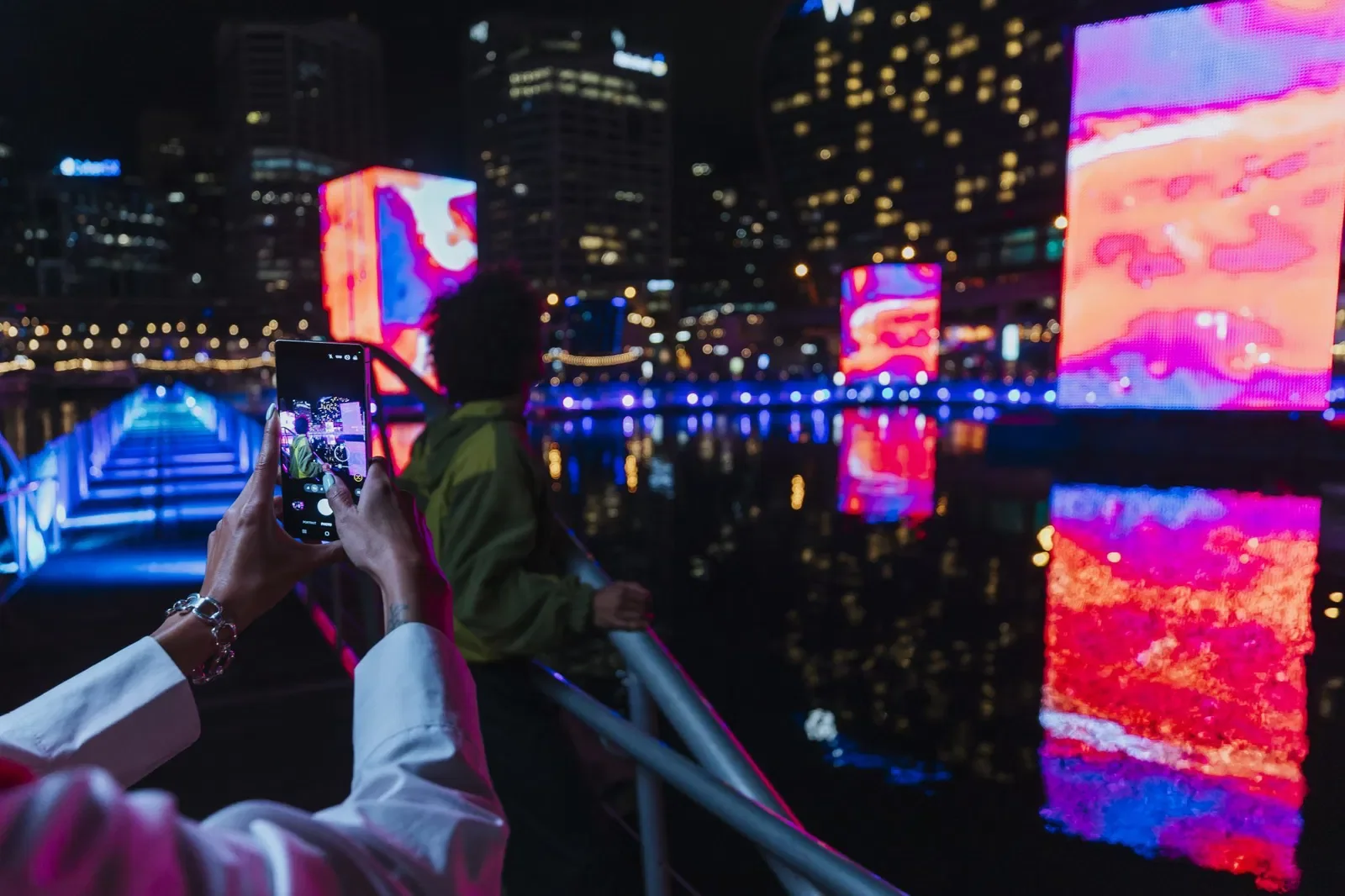 The installation transformed Sydney’s Cockle Bay Wharf in Darling Harbour into a luminous landscape of sound and light, featuring three towering 18-metre, four-sided structures.